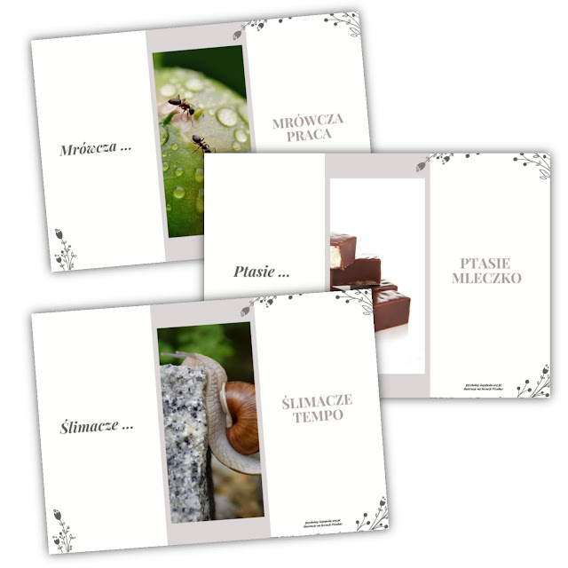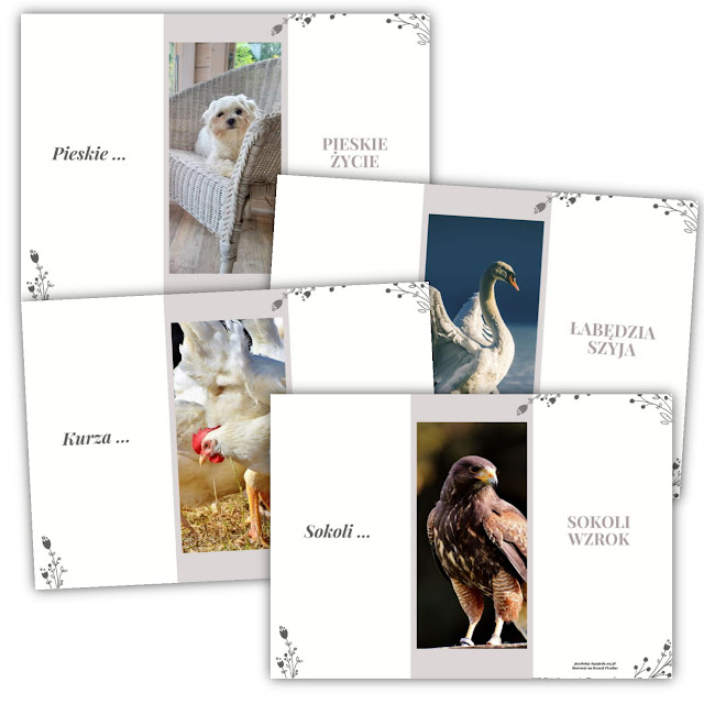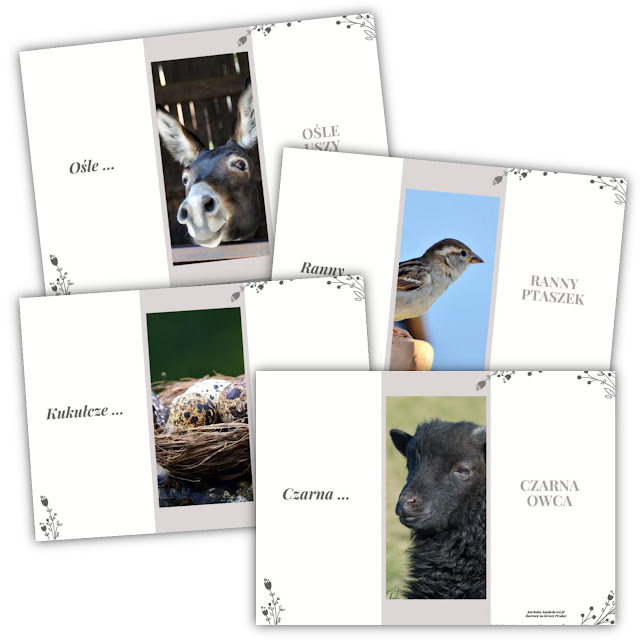 Karty rozwijają zasoby leksykonu umysłowego, ćwiczą dostęp do magazynu pamięci werbalnej poprzez torowanie kontekstowe (początek frazy, zdjęcie). Usprawniają mowę i pamięć. Każdą kartę warto przeciąć (jak na załączonych zdjęciach), by móc wykorzystać do ćwiczeń typu: 📌posłuchaj i dokończ z pamięci, 📌posłuchaj i znajdź odpowiedni napis (ćwiczenie czytania), 📌ja przeczytam całe wyrażenie (np. KAPUŚCIANA GŁOWA), a twoim zadaniem jest odnalezienie na stole zdjęcia (z początkowym słowem), 📌wybierz spośród wszystkich kart - te, które mają związek ze zwierzętami (z wykorzystaniem czytania lub na podstawie zdjęć). Załączone zdjęcia przedstawiają zawartość zestawu. Polecam 🙋🏻♀️