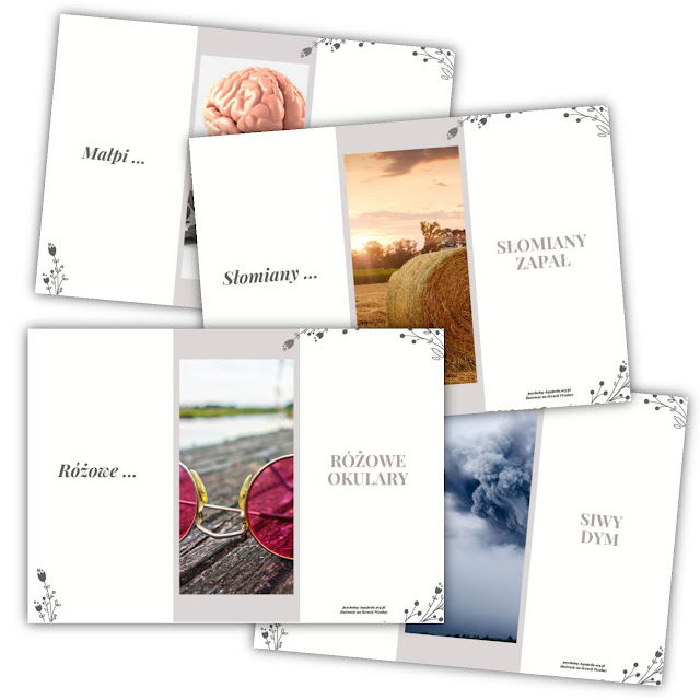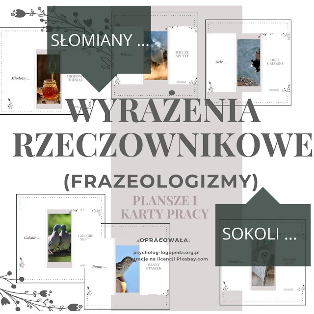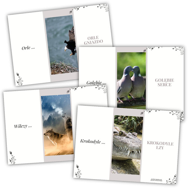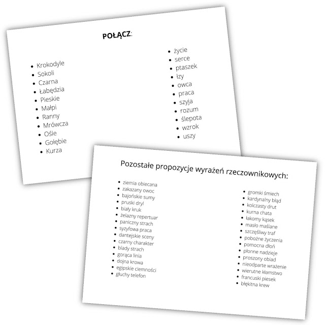 Polecam karty pracy do terapii afazji lub ćwiczeń szkolnych. 30 kart z wyrażeniami rzeczownikowymi (typu: złota rączka, słomiany zapał itp.), w tym 16 frazeologizmów ze zwierzętami (np. gołębie serce, wilczy apetyt). Zestaw zawiera także spis wielu innych związków frazeologicznych oraz ćwiczenie dopasowywania typu: POŁĄCZ: Krokodyle - - - - - - - - łzy itp.