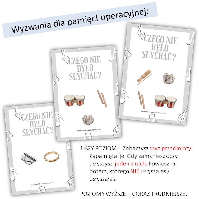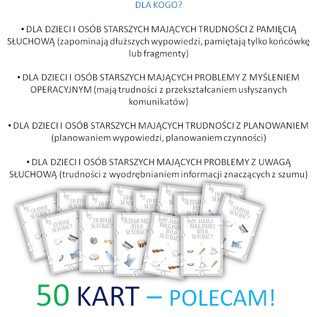 Załączone zdjęcia obrazują sposób wykorzystania i wybrane karty. W sumie jest ich 50. DLA KOGO SĄ POLECANE KARTY: 🔷 DLA DZIECI I OSÓB STARSZYCH MAJĄCYCH TRUDNOŚCI Z PAMIĘCIĄ SŁUCHOWĄ (zapominają dłuższych wypowiedzi, pamiętają tylko końcówkę lub fragmenty) 🔷 DLA DZIECI I OSÓB STARSZYCH MAJĄCYCH PROBLEMY Z MYŚLENIEM OPERACYJNYM (mają trudności z przekształcaniem usłyszanych komunikatów) 🔷 DLA DZIECI I OSÓB STARSZYCH MAJĄCYCH TRUDNOŚCI Z PLANOWANIEM (planowaniem wypowiedzi, planowaniem czynności) 🔷DLA DZIECI I OSÓB STARSZYCH MAJĄCYCH PROBLEMY Z UWAGĄ SŁUCHOWĄ (trudności z wyodrębnianiem informacji znaczących z szumu). Propozycje - jak pracować z kartami - znajdują się na załączonych zdjęciach. Polecam. Karty są w formacie A4 - proponuję ustawić podczas drukowania 2 strony na arkusz.Powrót do strony głównej - link.