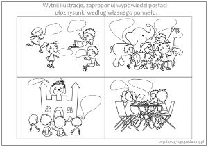 - samodzielne tworzenie historyjek obrazkowych i układanie do nich opowieści oraz wypowiedzi bohaterów - przykład: