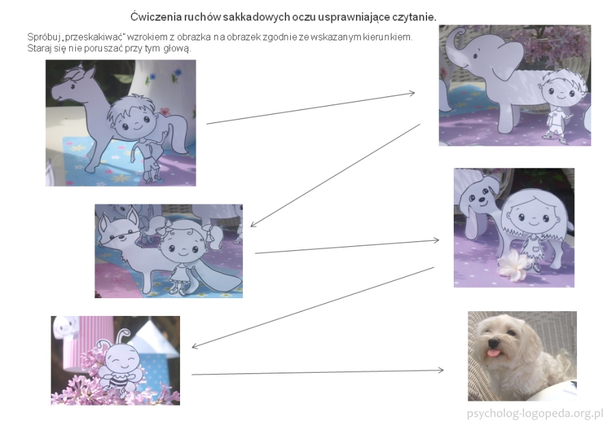 - ćwiczenia ruchów sakkadowych oczu (inaczej skokowych) - na początku warto zacząć od przestrzeni trójwymiarowej np. zachęcić dziecko do śledzenia piłeczki, podczas gdy rodzice (lub inni chętni) grają w ping-ponga; dobrym ćwiczeniem jest także rozłożenie przed dzieckiem kilku obiektów i zachęcenie go, by z chwilą usłyszenia nazwy obiektu szybko na niego spojrzało (ważne w tego typu ćwiczeniach jest to, by dziecko nie obracało głową, ale ruszało tylko gałkami ocznymi) - podczas ćwiczenia rodzic/nauczyciel "skacze" od słowa do słowa, a dziecko szybko spogląda na usłyszane obiekty. Przykład z nazwami wyciętych postaci i obiektów: słonik-lisek-wazon-stolik-zamek-osa-bez: