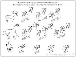 - priorytetem w treningu pamięci słuchowej jest nauka cichego powtarzania usłyszanych zdań (warto porozmawiać z dzieckiem o pamięci roboczej, która działa na zasadzie odświeżania danych w pętli i zachęcić dziecko do "pomocy" swej pamięci poprzez wyrobienie nawyku takiego odświeżania słów w myślach - powtarzania ich aż do momentu zapisania na kartce lub przeniesienia do pamięci długotrwałej),