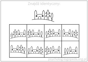 - karty pracy o rosnącym stopniu trudności typu: spójrz na rysunek, zasłoń go i spróbuj narysować podobny lub wskaż identyczny spośród dwóch (lub kilku) przedstawionych grafik - przykłady:
