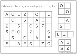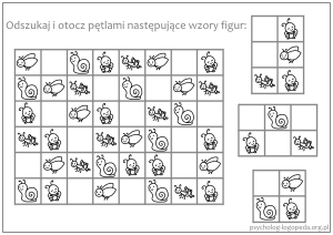 - karty pracy o rosnącym stopniu trudności poświęcone rozpoznawaniu wzorów graficznych (także liter i cyfr) - przykłady kart pracy: